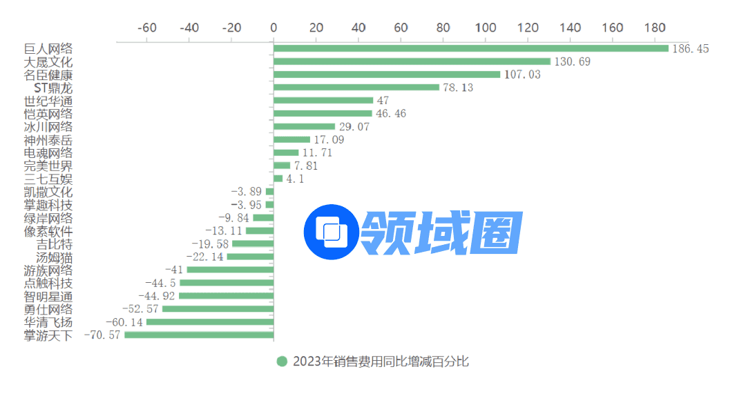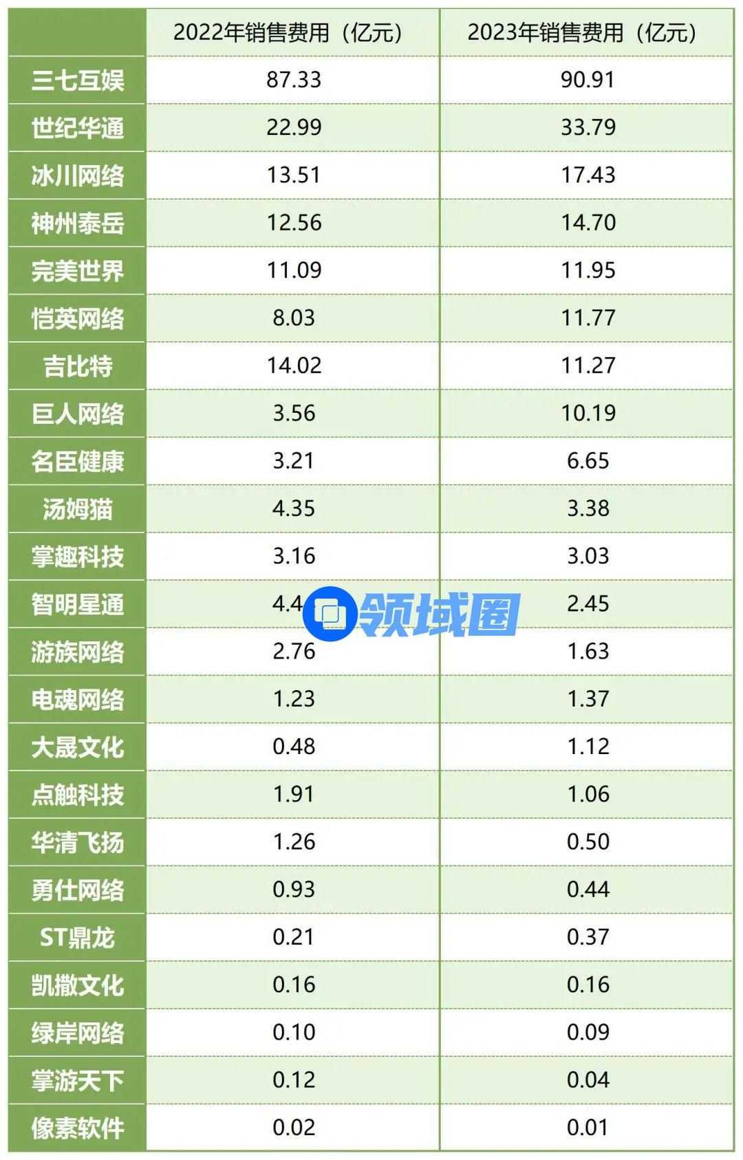 而如果从增长的金额来看,2023年,销售费用增长排名前五的分别是世纪华通(增长10.8亿元),巨人网络(增长6.64亿元),冰川网络(增长3.93亿元),恺英网络(增长3.73亿元),三七互娱(3.5亿元),名臣健康(3.44亿元)。