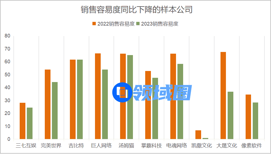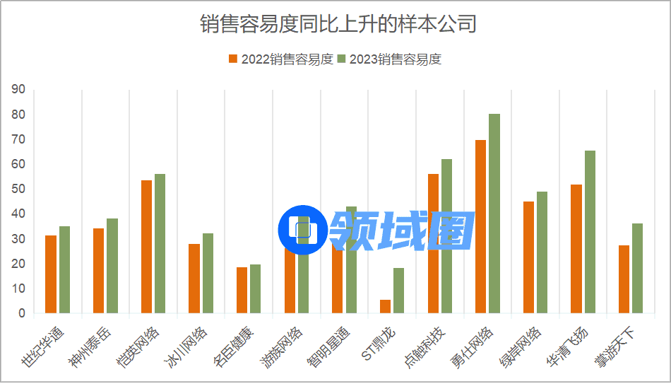 2023年,23家游戏厂商中,销售容易度增长的有:世纪华通,神州泰岳,恺英网络,冰川网络,名臣健康等13家厂商。