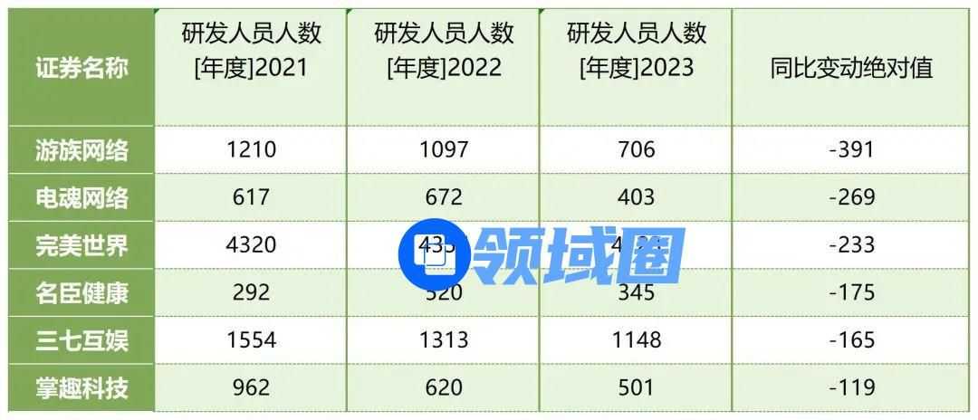 具体到厂商来看,2023年研发人员数量同比下降最多前六名分别为:游族网络,电魂网络,完美世界,名臣健康,三七互娱,掌趣科技。