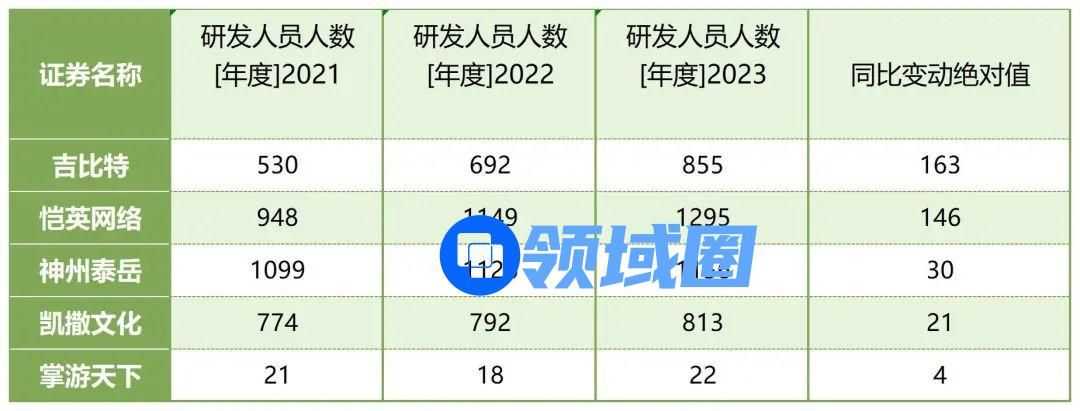 在这5家厂商中,吉比特研发人员数量增长最多,同比增加163人。其次分别是恺英网络(增加146人),神州泰岳(增加30人),凯撒文化(增加30人),掌游天下(增加4人)。
