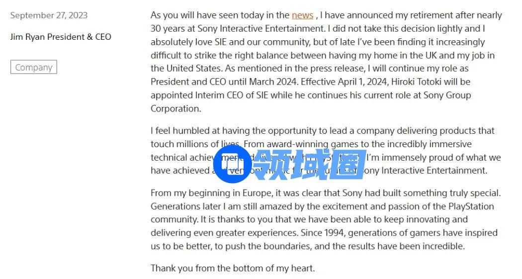 在此之前,去年9月,时任SIE总裁兼首席执行官吉姆·瑞恩宣布,由于“难以在英国的家和美国的工作之间取得平衡”,自己将于2024年3月退休,结束在PlayStation业务中近30年的工作。