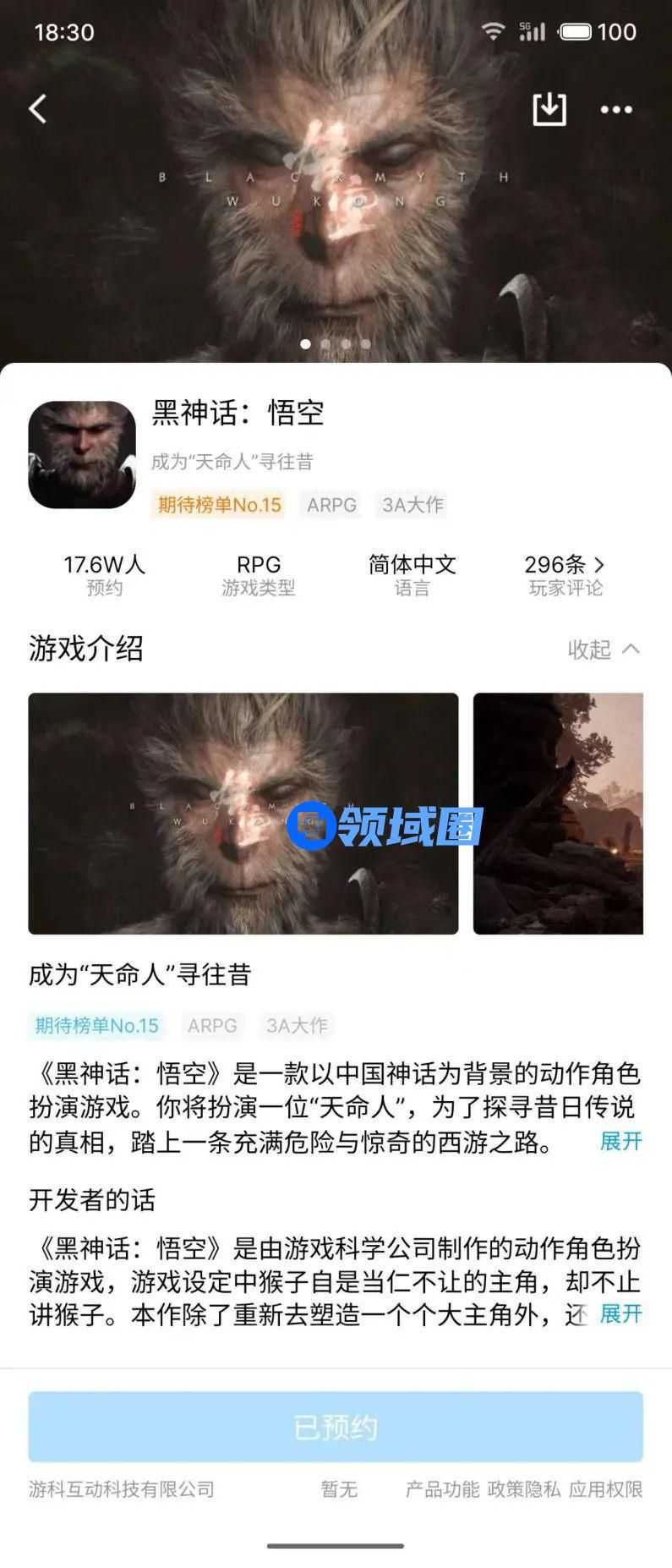 如果用手机点击该活动网址,会直接跳转到QQ游戏平台的预约页面。目前QQ游戏平台的《黑神话:悟空》预约数量已经达到17.6万,近300条玩家评论。