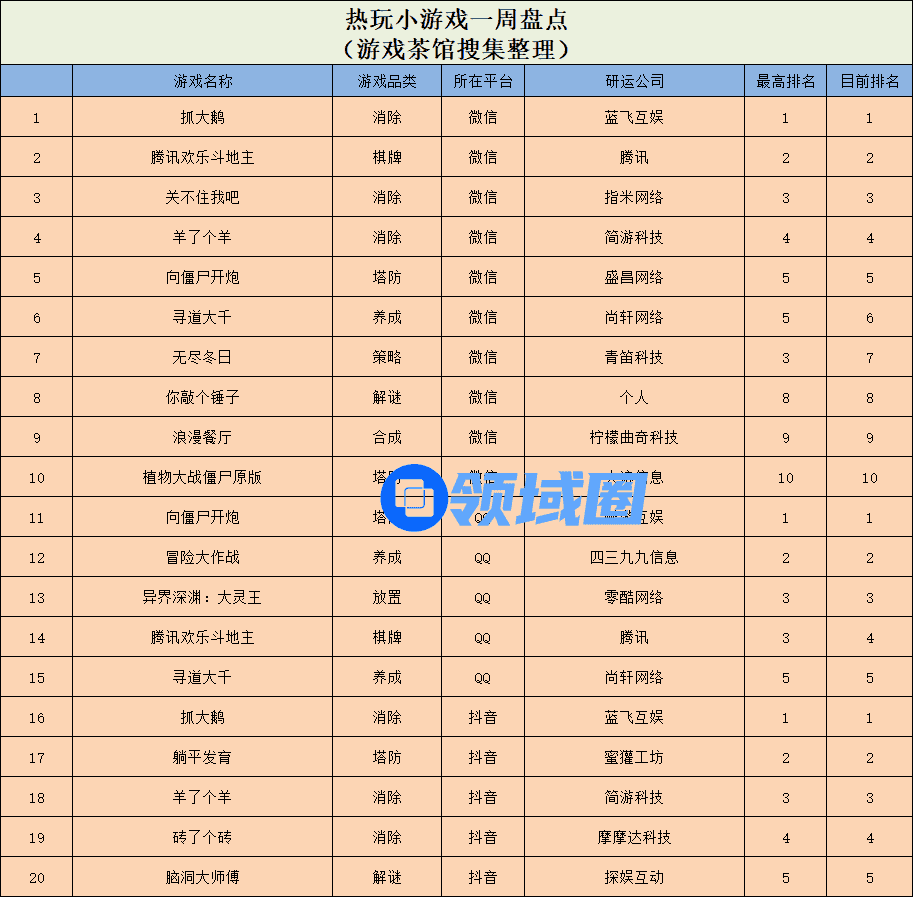 休闲新游周报每周统计微信小游戏、QQ小游戏、抖音小游戏、硬核小游戏以及App Store和Google Play上的新游爆款,并按照分类制作表格,将游戏排名情况等信息公布,希望给到行业同侪帮助。
