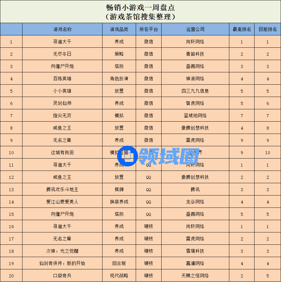硬核小游戏畅销榜前列本周也不见新鲜面孔,榜单前二分别由三七互娱旗下《寻道大千》和《无名之辈》囊括,来自途游的“史莱姆like”《次神:光之觉醒》和仙剑回合制游戏《仙剑奇侠传:新的开始》本周则分别位于榜单第3和第4名。