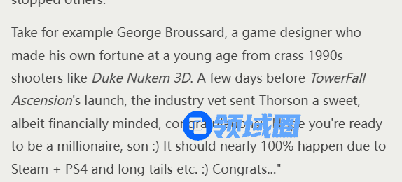 好了,让我们回归故事主线。2014年,在独占协议到期时,托森将《塔楼坠落》重制,并发布到了steam和PS4上,更名为《TowerFall Ascension》,进一步扩大了销量。在这里我要提一个小插曲,开发了《毁灭公爵3D》的游戏圈大佬乔治·布鲁萨德曾给托森写过一封电邮,说道:希望你已经准备好成为百万富翁了小子(笑),你绝对会对steam和PS4的长尾销量感到开心(笑)。