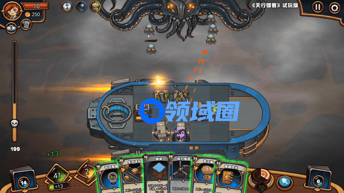 总体来说,玩法上还是相对简单的,就是最经典的卡牌游戏与塔防游戏融合的玩法,你需要不断打出卡牌并且放置在飞船上阻止怪物的入侵。