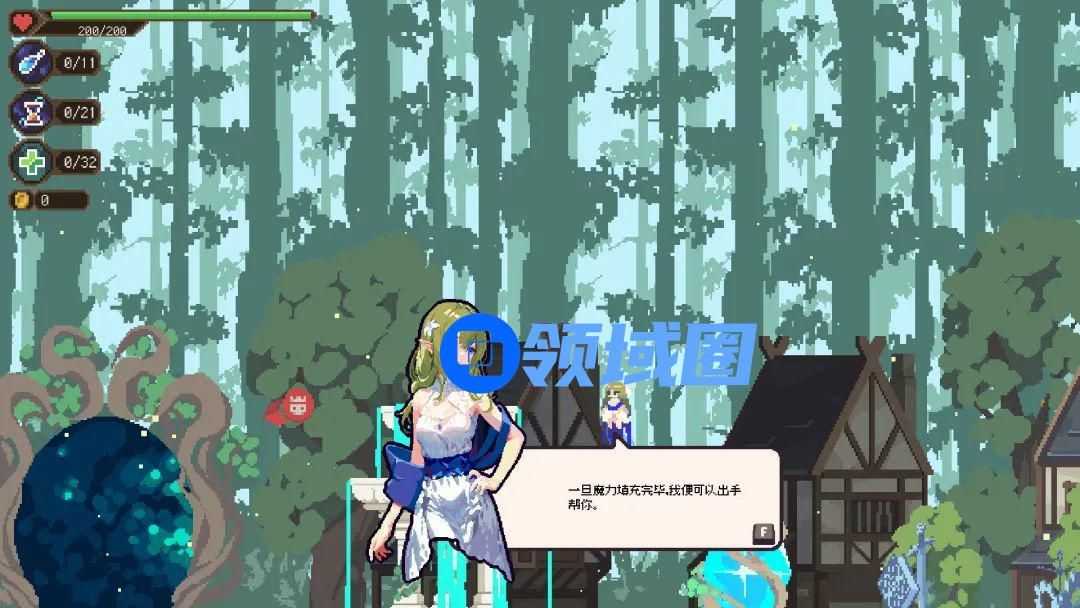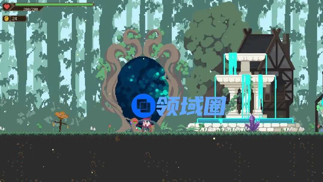 冲刺、降落斩击、蹬墙跳跃,苏醒后的魔女一路向上走,将玩家带至了花瓣纷飞、被苍柏和木屋环绕的“泉之乡”。静谧与温柔,是茶馆对“泉之乡”的第一印象。