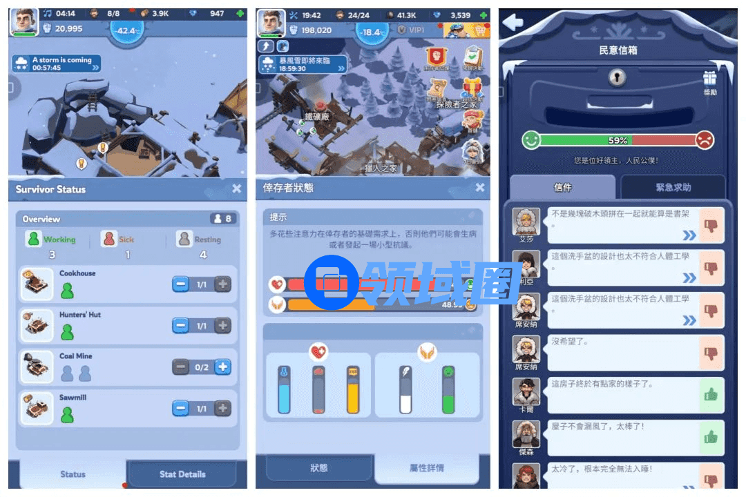 游戏的早期阶段以“经营”模块为主,玩家需要根据任务引导,分配幸存者,去从事猎人、厨师、伐木工人等等工作,收集食物、木材等资源,然后利用这些资源去升级建筑,提升资源收集效率,挽救更多幸存者,度过艰难的暴风雪挑战,优化幸存者的生活环境,达成资源生产与消耗的有机循环。