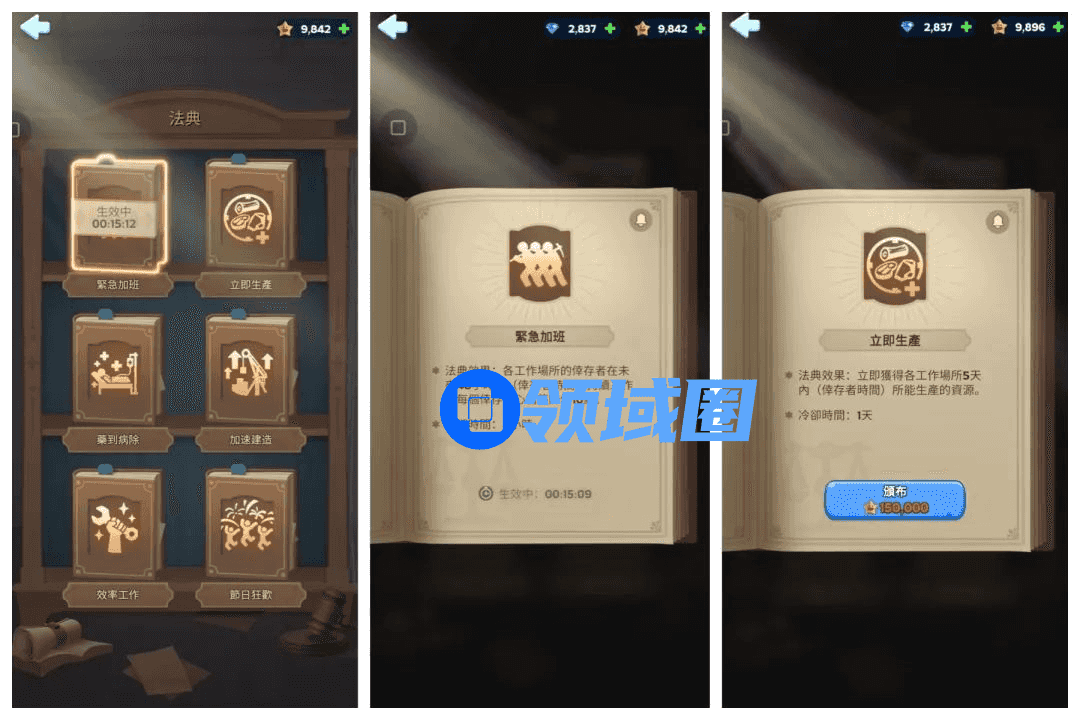 同时,玩家从居民身上收集而来的“满意度”,还可用于颁布“法典”,更加灵活地协调城镇经营效率。比如颁布“紧急加班”法典后,幸存者会持续工作48小时,同时心情值降低10点;“立即生产”法典生效后,玩家将立即获得幸存者在5天内可产出的资源。