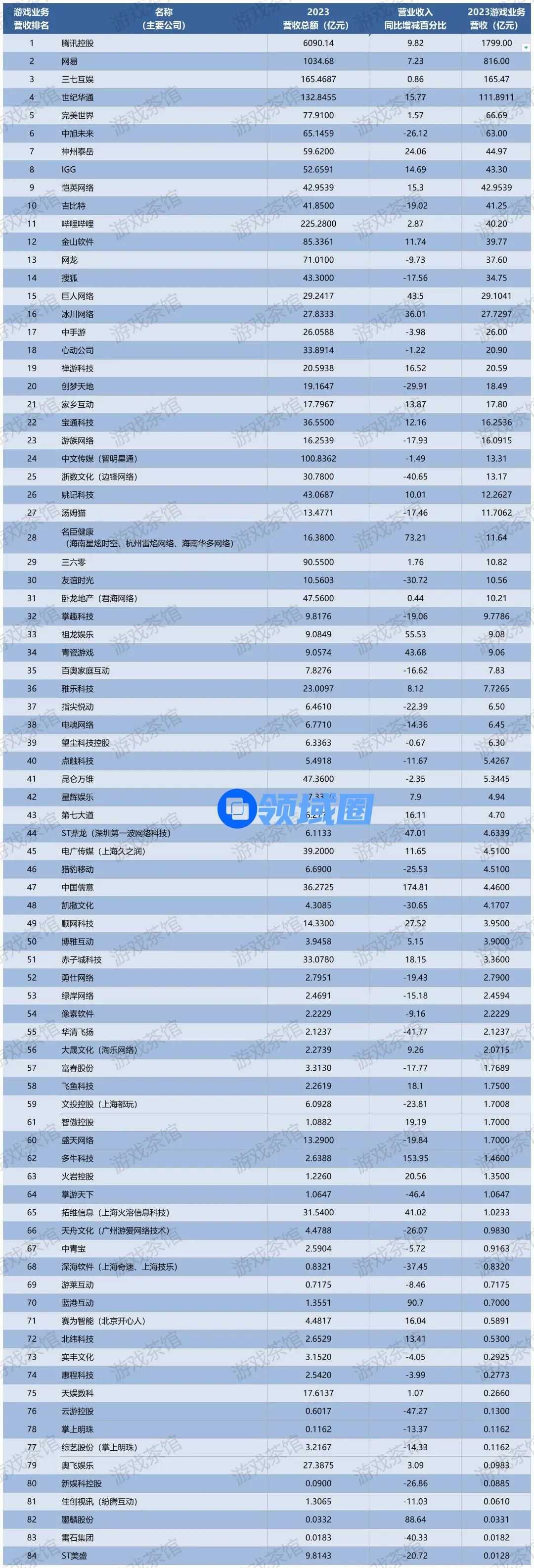 2023年,腾讯和网易的游戏业务营收分别为1799亿元和816亿元,分别同比增长5.3%和9.43%。紧随其后的是三七互娱和世纪华通,游戏业务营收分别达165亿元和109亿元。