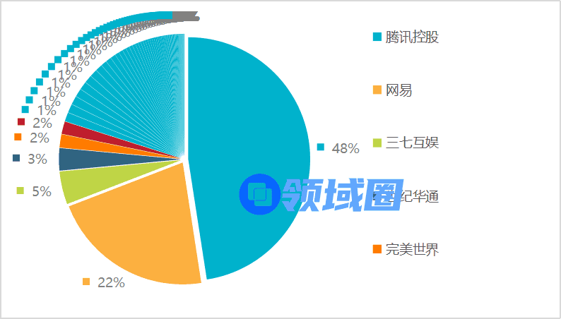 排名前五的分别为:腾讯(1179亿元)、网易(816亿元)、三七互娱(165.47亿元)、世纪华通(111.89亿元)、完美世界(66.69亿元)。