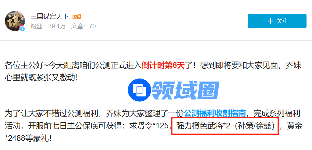 更何况,《三谋》公测首发活动送橙卡武将“孙策”和“徐盛”,再加上6元礼包的“大乔”,一开服我就能凑出一套平民战神队伍“孙大盛”,完全能满足游戏前期开荒需求。