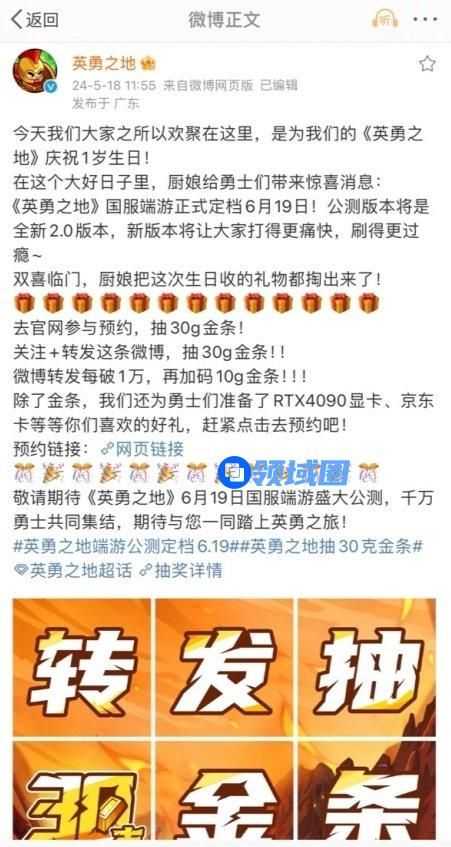除了原先预约活动上的30g金条、RTX4090显卡等高价值实物奖励以外,此次官微亲自下场,额外再抽30g金条,并称转发每超1万就再加码10g,实属是财大气粗;经过《英勇之地》一系列的营销动作,不难看出,6月19日他们将会有更大的推广动作,从侧面也反映出该款游戏在点触科技的产品线中的重要性。