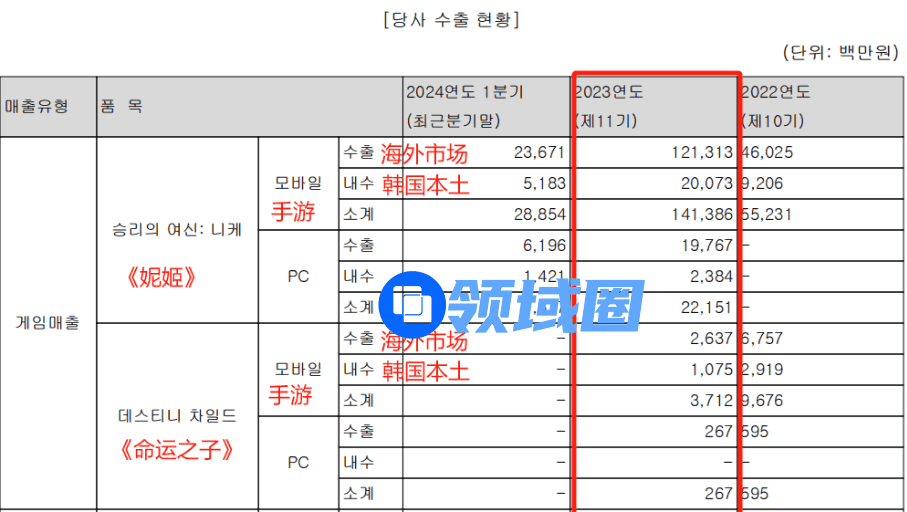 《妮姬》的营收主要来自韩国以外的全球市场。2023年,《妮姬》韩国本土营收仅223亿韩元(约1.18亿元),海外市场营收共计约1411亿韩元(约7.53亿元)。