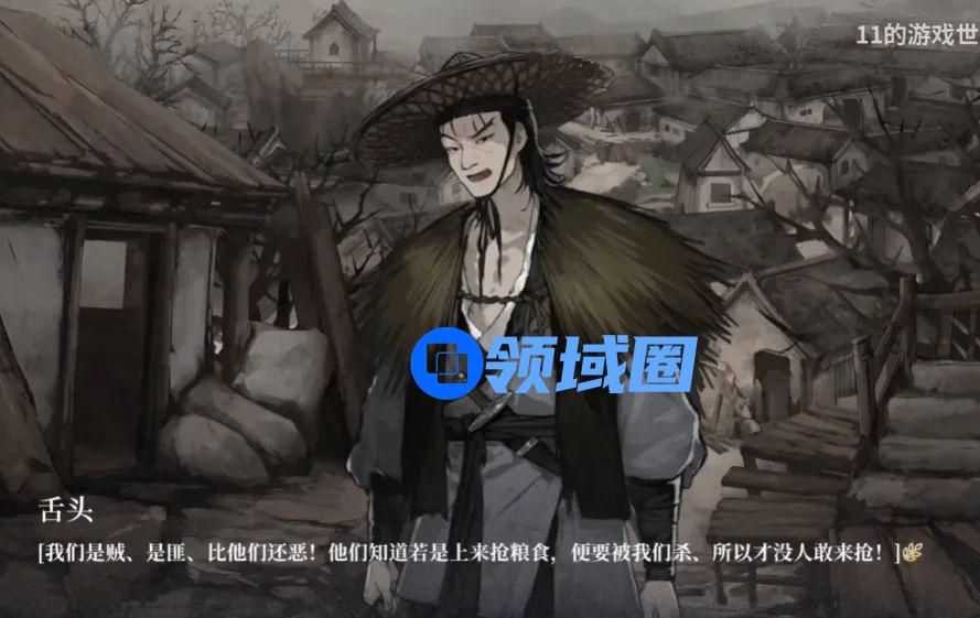 而主角一行人行至一个人吃人的村落,村民想要把他们扣下来吃掉,因为良和舌头武力太强,村民反过来以饥饿的可怜人向他们求一点干粮,当“良”选择分出干粮的时候,同伴舌头会点出村民不敢抢粮食的原因,”我们是贼、是匪、比他们还恶!他们知道若是上来抢粮食,便要被我们杀。所以才没人敢来抢!“