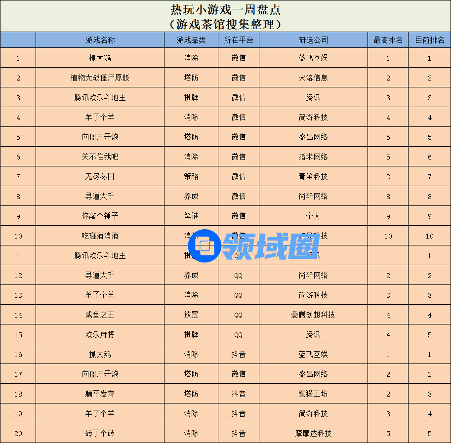 休闲新游周报每周统计微信小游戏、QQ小游戏、抖音小游戏、硬核小游戏以及App Store和Google Play上的新游爆款,并按照分类制作表格,将游戏排名情况等信息公布,希望给到行业同侪帮助。