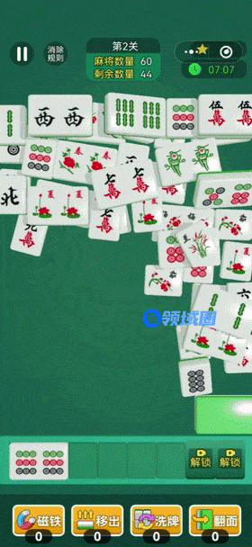 《吃碰消消消》的玩法是类似于《羊了个羊》的堆叠消除玩法,不过该游戏选用了传统的麻将题材,对于麻将的元素应用不仅体现在砖块设计上,消除逻辑也从普通的三个一样的砖块完成消除,变成了麻将当中的“碰、吃、杠”,只有放进钻槽中的砖块满足“碰、吃、杠”条件,才能完成消除。