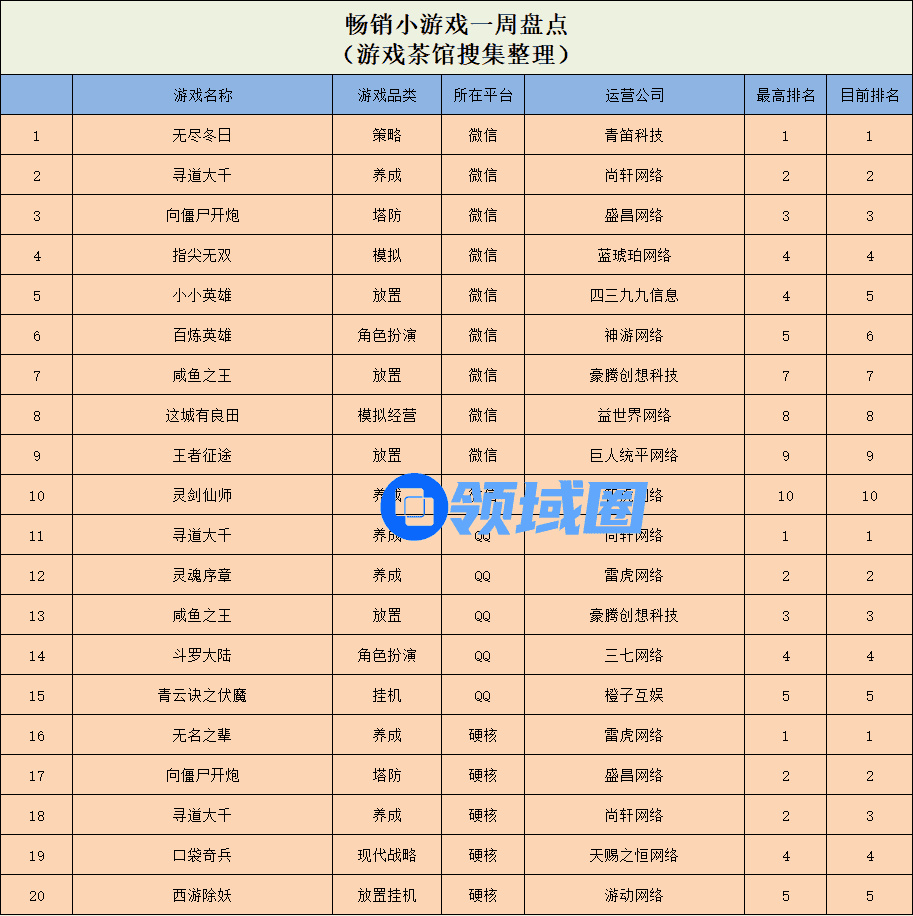 硬核小游戏畅销榜单中,三七互娱旗下的另一款“开箱子like”《无名之辈》登顶,《向僵尸开炮》和《寻道大千》紧随其后位列榜单第2和第3名,同时,放置挂机玩法的《西游除妖》本周也冲上了硬核小游戏畅销榜单前列,且其当前位于榜单第5名。