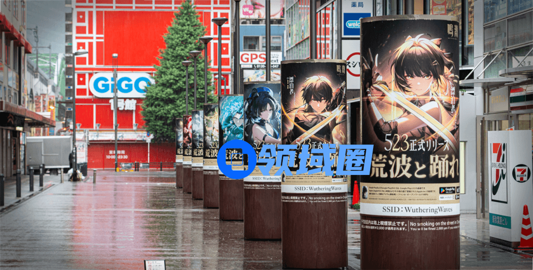 仅从宣发来看,在公测前,《鸣潮》项目组已经在日韩、北美等世界多个主要国家和地区开展了线下布局,除了老生常谈的广告牌、地铁交通枢纽等常规营销位置外,库洛还开展了主题“痛车”公路之旅,将男女主“漂泊者”的足迹留在了北美大盐湖的天空之境、纪念碑谷的漫漫砂岩中,镌刻有《鸣潮》印记的车辙,也留在了江南道的微风、台北的人声鼎沸以及东京的霓虹里。