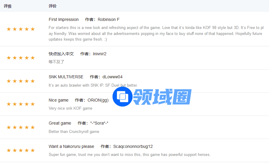 数据霸榜是一方面,在商店评论区,众多欧美玩家也对该作表达了高度认可,诸如“3D画面很精美”、“大招炫酷”、“玩法丰富”、“比XX游戏要好”、“很良心”等关键词出现频次居多,尤其是对情怀方面的满足,《SNK: All-Star Brawl》正所谓“做对了菜”,在宣发层面能让欧美玩家主动形成自来水,为该作的用户拉新、日活以及长期留存打下了扎实的基础。