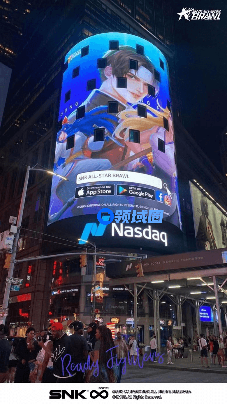 而在线下,开服当天《SNK: All-Star Brawl》更是直接登陆美国纽约纳斯达克大屏,连续3天投放大屏广告,与线上游戏社区联动,拉动玩家互动。线上与线下的组合宣发,成为《SNK: All-Star Brawl》的口碑塑造、全球开花的一大推手。