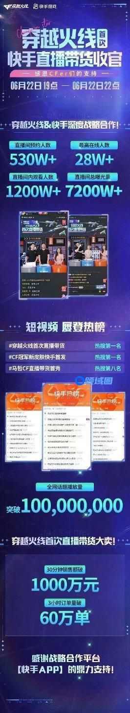 据官方数据显示,本次直播带货活动吸引了超过530万人预约观看,实际观看人数更是达到了1200万之多,最高在线人数28万,作为CF首次尝试直播带货的新模式,其表现相当亮眼。同时,这场直播带货全网话题曝光量超1亿次,相关话题两度登上快手热榜第一名,为CF的用户增长和活跃度提升做出了积极贡献。