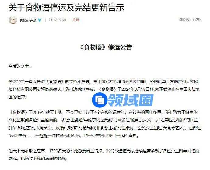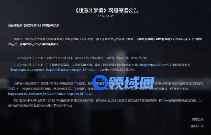 此前,《超激斗梦境》与《食物语》官方都于4月17日发布了关服公告,并在最后这两个月的时间里对各自玩家进行了游戏内补偿。