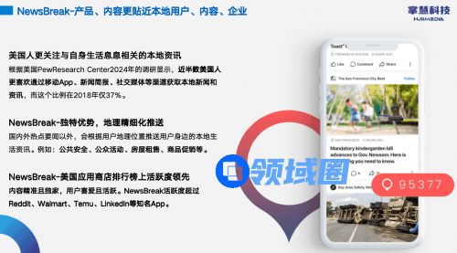 1.深入了解目标受众群体:在美国,比起关注国家大事,一大部分美国人更关注那些与自身生活息息相关的本地资讯。根据美国Pew Research Center在2024年最新发布的调研结果,近半数的美国人更喜欢通过移动app、新闻简报、社交媒体等渠道获取本地资讯,而这个比例在2018年仅37%。NewsBreak的用户遍布全美两万多个城市,63%属于27至58岁的主流消费群体,平均家庭年收入超过7万美元,生活稳定且大多数拥有自己的房产,有充裕的闲暇时间来阅读和了解资讯。这样的用户基础,不仅保证了资讯传播的深度和广度,更为内容创作者和广告主带来了极具价值的受众群体。