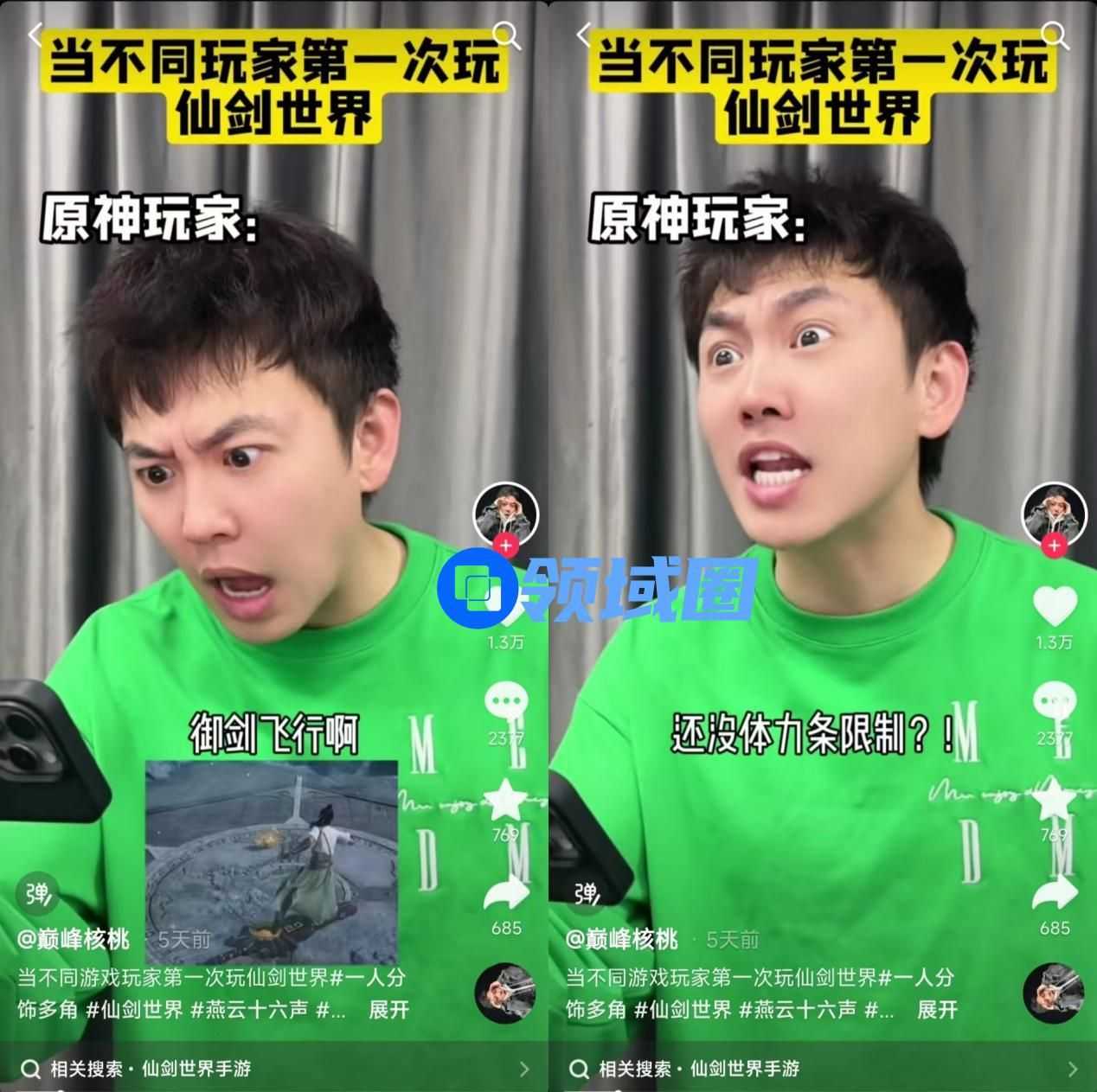 我还在抖音上看到一位“整活小能手”关于仙剑的段子,点赞很会就过万了,段子虚构了仙剑世界玩家和原神、阴阳师、鸣潮、幻兽帕鲁等游戏玩家的隔空探讨,其中那个原神玩家看到御剑飞行那个没体力限制的羡慕,真的是让这个籼原双厨感触满满,如果我原的体力条也能改成没有限制该多好啊。三测期间,这种其他平台上玩家自制的内容可谓多了去了。