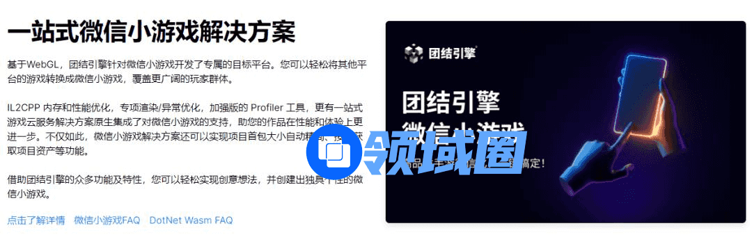 厂商将中重度游戏游戏反向搬到小游戏平台也成现象。Unity的“团结引擎”则提供了一站式微信小游戏解决方案,在性能优化等常规功能之外,能够更好的帮助厂商搬运游戏到小游戏平台。
