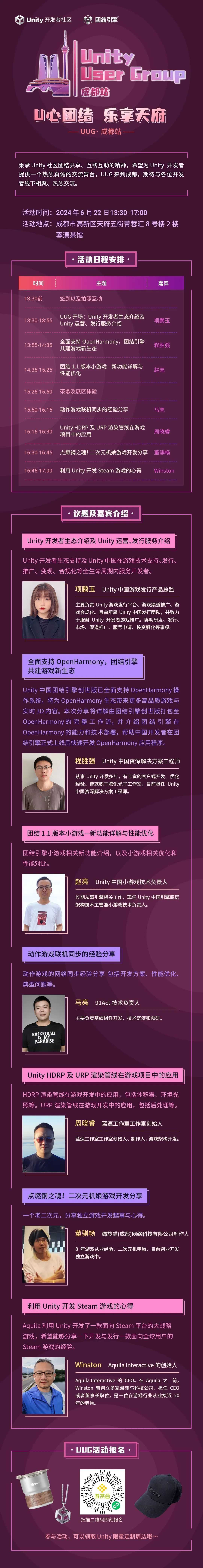 6月22日,Unity中国将在成都举办一场围绕“团结引擎”的技术交流大会,欢迎所有成都、重庆周边的开发者,免费参与。