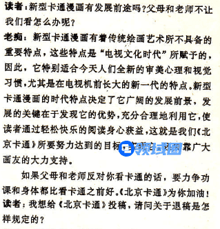 老痴:读者通过轻松快乐的阅读身心获益,这就是我们《北京卡通》所要努力达到的目标。如果父母和老师反对,要力争功课和身体都比看卡通之前好。