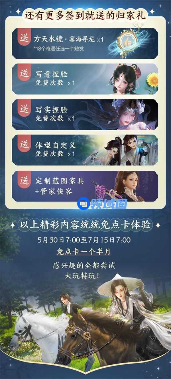 江湖任潇洒,无岁不逢春,今日公测开启后,签到14天连玩带拿,国创主题外装成衣零元购!超多类型多重好礼等你来领,奇珍异宝,目不暇接!