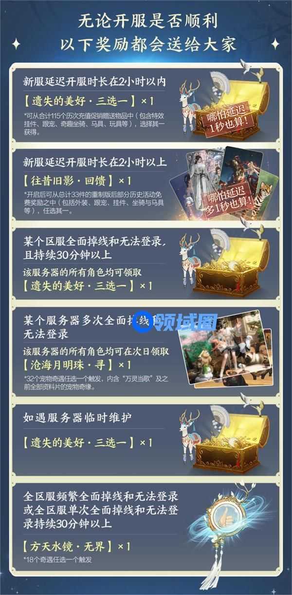 感谢侠士们一直以来的支持!这次开服无论服务器是否出现波动或者BUG等情况,侠士们都能领到所有奖励!所有角色均可在6月14日10:00后直接领取【遗失的美好·三选一】3份、【往昔旧影·回馈】、【沧海月明珠·寻】和【方天水镜·无界】超重磅奖励,上百件挂件、跟宠、奇趣坐骑等任你挑选!此外也请侠士们谅解,尽管我们做好了很多准备,但公测当日仍然存在着一些不可预知的情况。不过请侠士们放心,我们研发团队、运营团队、客服团队,全部严阵以待,我们会以最快的速度响应和处理问题,请相信我们会妥善解决。