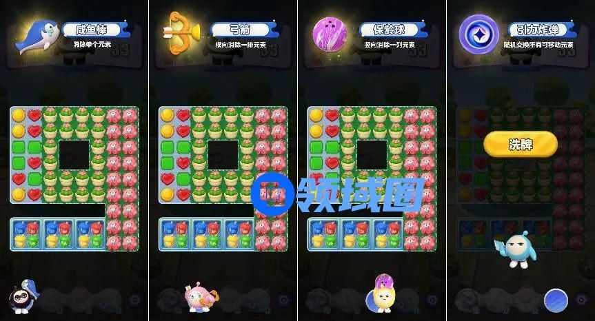 玩家在消除过程中遇到挑战的时候,还可以使用关卡下方的“咸鱼棒”(消除单个元素)、“弓箭”(消除一排)、“保龄球”(消除一列)和“引力炸弹”(随机洗牌),降低闯关压力。