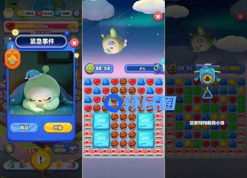除了普通关卡,《蛋仔滑滑》还额外增加了紧急事件和奖励关卡。其中紧急事件关卡结合了角色剧情,通关限制也从常规关卡的步数变成了时间。比如蛋小绿在睡梦中不小心从天上掉下来,玩家需要在指定时间内完成消除目标,才能获得YOYO,成功解救蛋小绿。