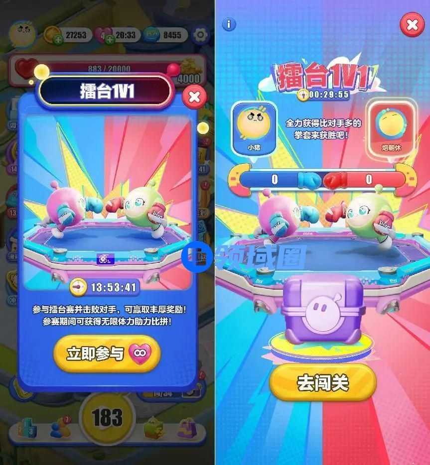 此外,该游戏还设计了一个轻度pvp玩法——“擂台1V1”,玩家参与擂台活动之后,可以匹配玩家进行积分对决,当对决时间结束,我方通过消除闯关获得的积分更高,即可获得更多系统奖励。