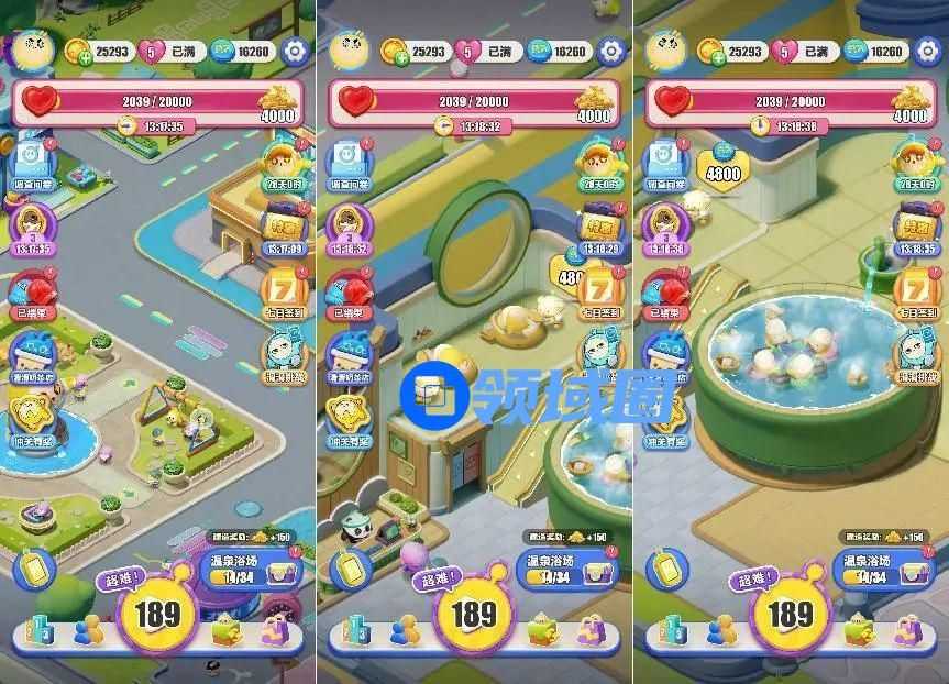 和消除部分相较,家装部分的内容占比相对较少。玩家在完成关卡后,可以直接耗费通关累积的瓶盖,建造岛屿上的奶茶店、温泉浴场等建筑和店铺,同时获得对应的金币奖励,金币可用于获取消除所需的体力。不过玩家在建造过程中能够参与的内容有限,这些建造过程都会自动完成,玩家不能对其进行样式选择和位置调整。
