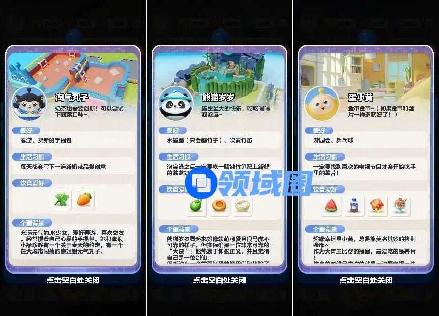 而且在《蛋仔滑滑》中,所有的小蛋仔们都有了更加丰富的设定,比如蛋小黄一定要找到喜欢的电视节目才会开始吃手里的薯片,比如经营奶茶店的淘气丸子是一位元气满满的JK少女,再比如温泉浴场的老板熊猫岁岁是一个想要打击坏蛋的正义“大侠”……在推进建筑搭建的过程中,我们将逐渐解锁这些角色和与其相关的小剧情。