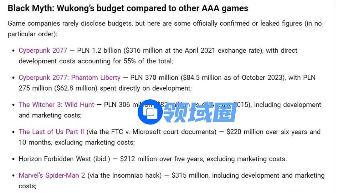 在上周,杭州税务局的一则消息透露了《黑神话:悟空》可能的开发成本,即3000到4000万美元左右,10月10日,海外媒体GameWorldObserve发表文章称,《黑神话:悟空》的开发成本远远低于一众海外3A游戏,并列举了《赛博朋克2077》、《巫师3:狂猎》、《漫威蜘蛛侠》等作为对比。