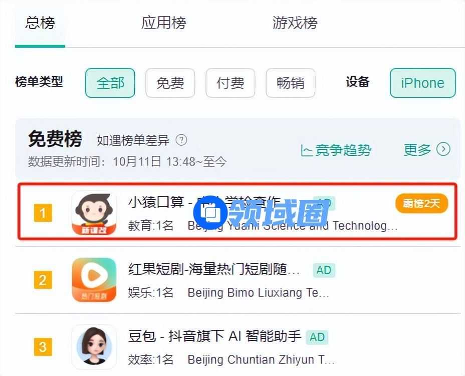近日,猿辅导旗下的中小学检查作业和学习工具《小猿口算》APP冲上了iOS免费总榜第一。