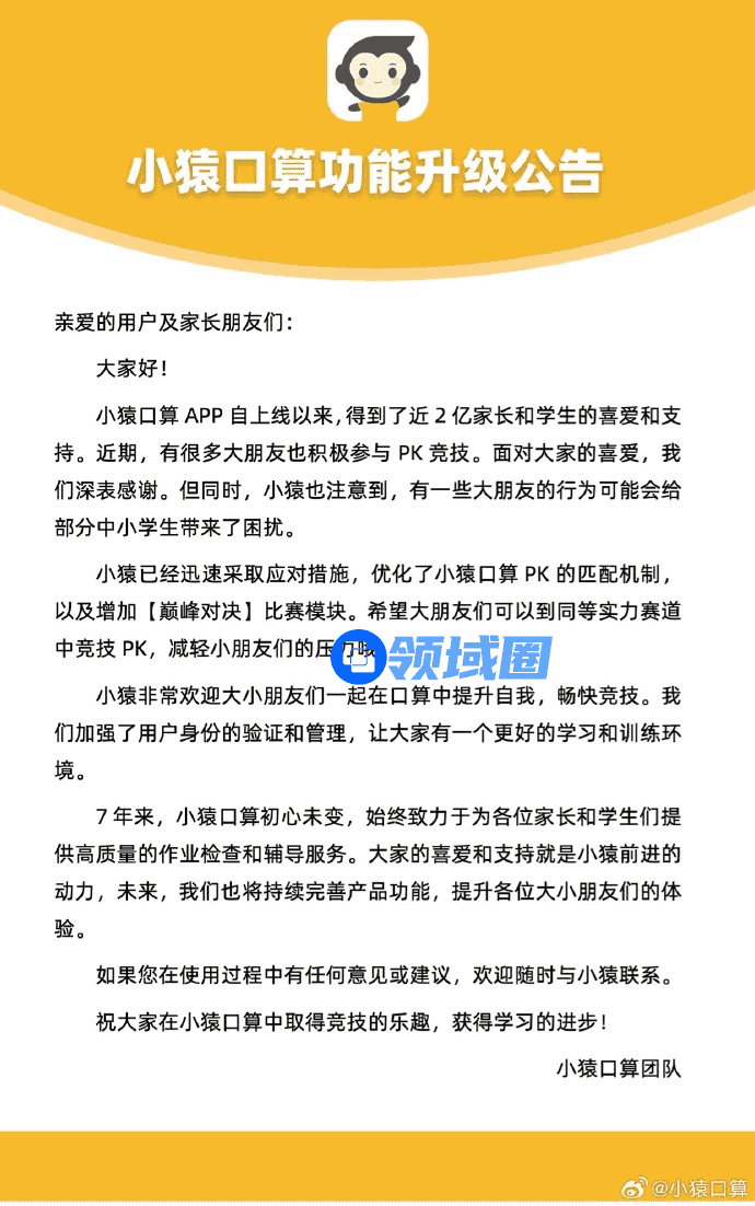 今日,《小猿口算》官方发布公告,称团队已迅速采取应对措施,优化了小猿口算 PK的匹配机制以及增加【巅峰对决】比赛模块。官方还在公告中表示:“希望大朋友们可以到同等实力赛道中竞技 PK,减轻小朋友们的压力。”