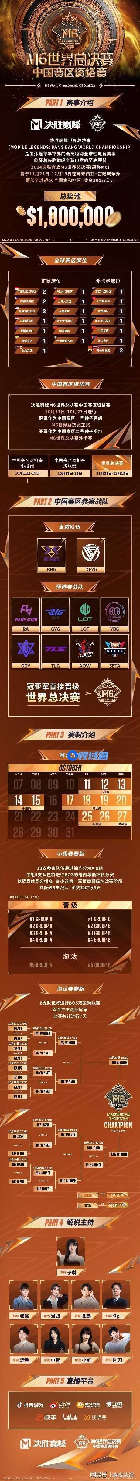 10月11日,决胜巅峰M6世界总决赛中国赛区资格赛正式打响。10月11日-27日,DFYG、KBG、AOW、GDY、GYG、LOT、RA、SETA、TLG、YBG共10支新豪强战队将悉数登场,对2个M6世界总决赛名额发起冲击。冠军战队将代表中国赛区,首次晋级M6世界总决赛正赛;亚军战队将参加M6世界总决赛外卡赛。