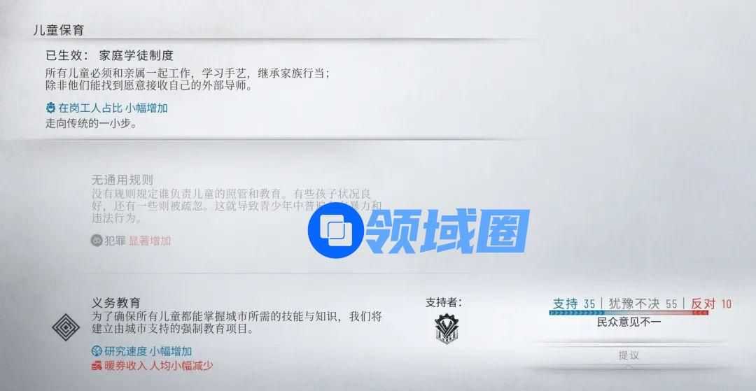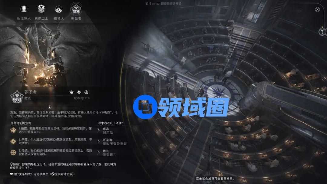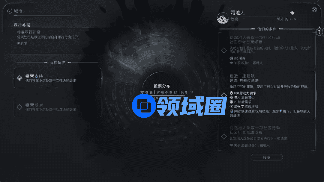 与各个派别交涉的砝码主要有三个:颁布对应派别思潮的法律法规、研究相应的科技、建造相应的建筑等,这些砝码会直接影响到玩家对城市的规划。这就相当于给玩家的城建增加了一个衡量标准——不能无脑以抵御暴风雪为目的,还要考虑城市的派别是否支持。所以说,城建玩法在后期更像是议会玩法的附属品,是议会交易的“货币”。这样的思路在一款SLG游戏中可谓独树一帜,也让许多玩了前作,想在续作中继续猛猛种田的玩家们感到失望,成为了游戏口碑两极分化的源泉之一。