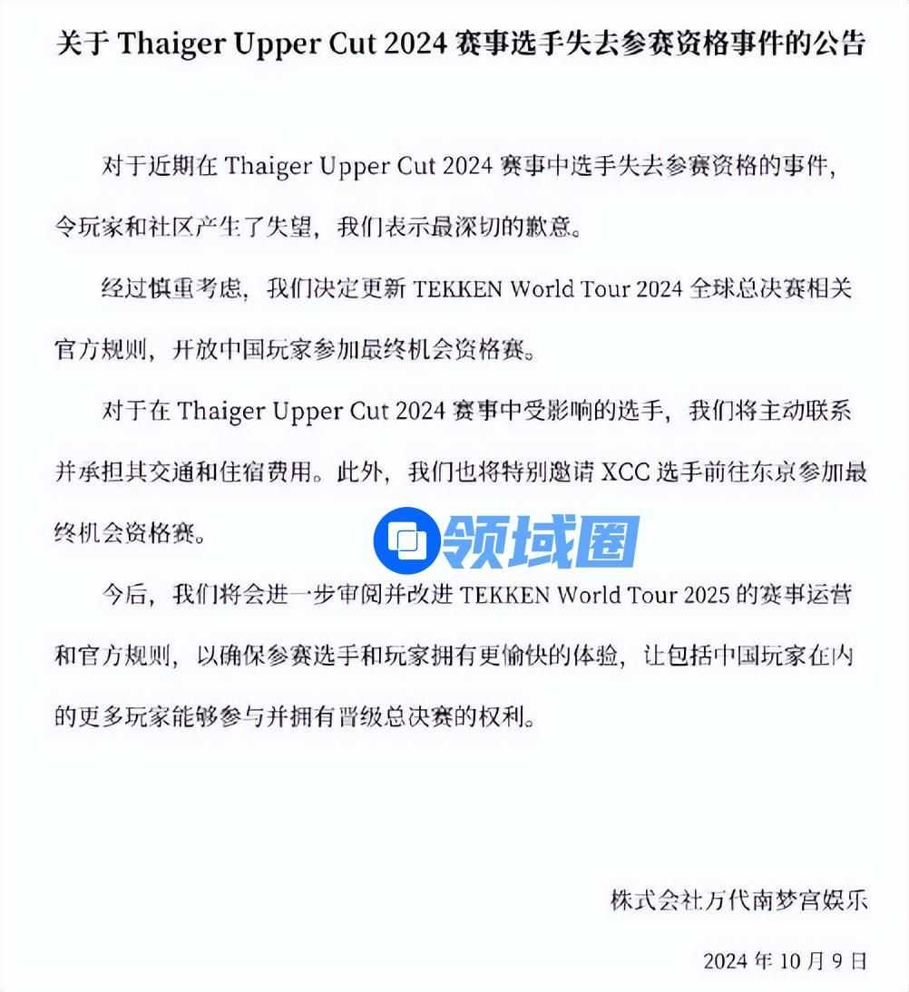 今(9)日,一直保持沉默的南梦宫万代中国终于代表总部发声,除了道歉之外,还将修改赛事规则,将邀请XCC选手参加最终资格赛,承诺明年的TWT 2025赛事将对中国大陆选手开放。