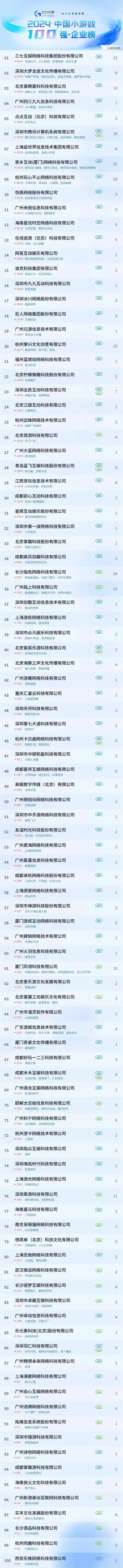 数据源均来自于小游戏平台官方每日的榜单数据,引力引擎统计了2024年219家畅销榜(IAP)公司主体和171家畅玩榜(IAA)公司主体共计929款上榜产品数据,最终得到中国小游戏100强企业排名,因此该百强企业榜单具有公正、客观、权威的属性。