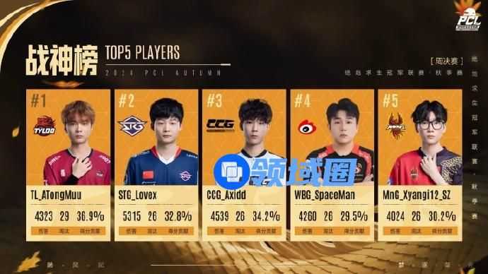 而TL战队的ATongMuu、STG_Lovex 、弟弟ovo05 、DDT_SpaceMan 、xyangigg五人则是名列战神榜。