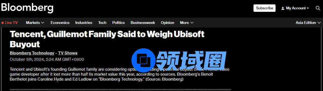 而当时间来到10月5日,彭博社一则消息似乎为育碧带来了转机。消息中,彭博社方面信源称,腾讯正在与育碧创始人Guillemot家族讨论育碧的收购计划,希望通过这种方式挽救育碧于水火之中。