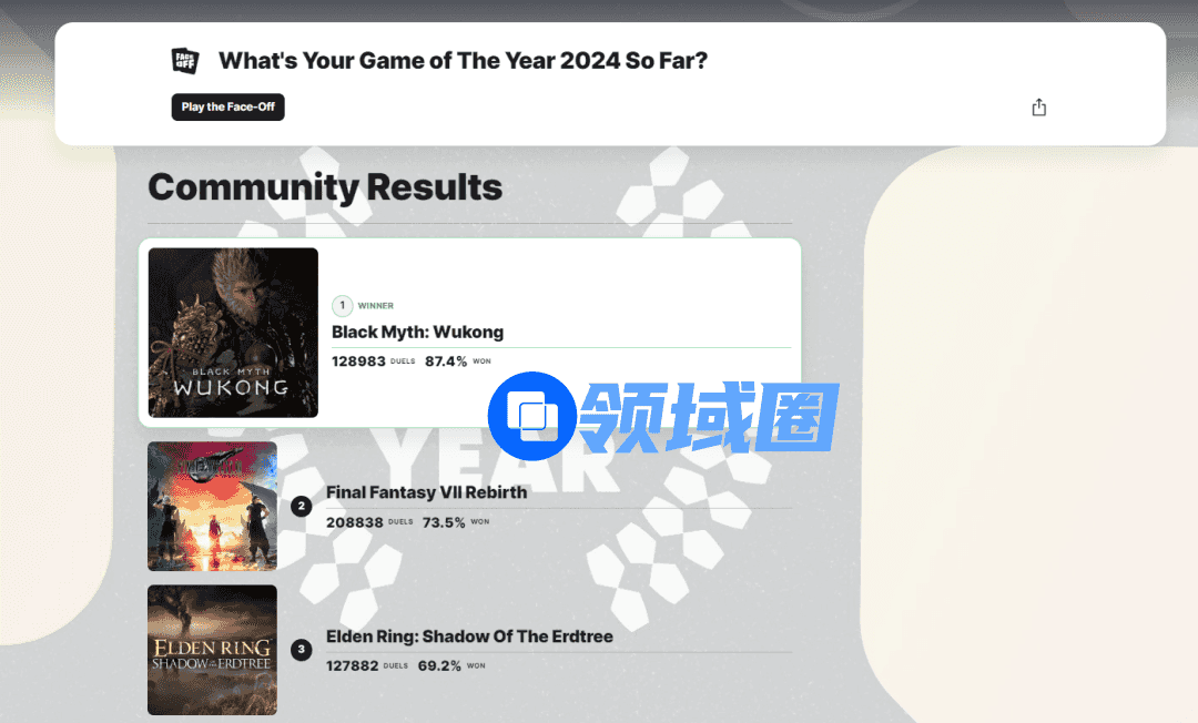 近日,IGN社区年度游戏投票正式开启,经过几天的角逐后,《黑神话:悟空》于9月22日正式登顶票选榜榜首,截至23日下午,依然以87.4%的胜率稳居第一。