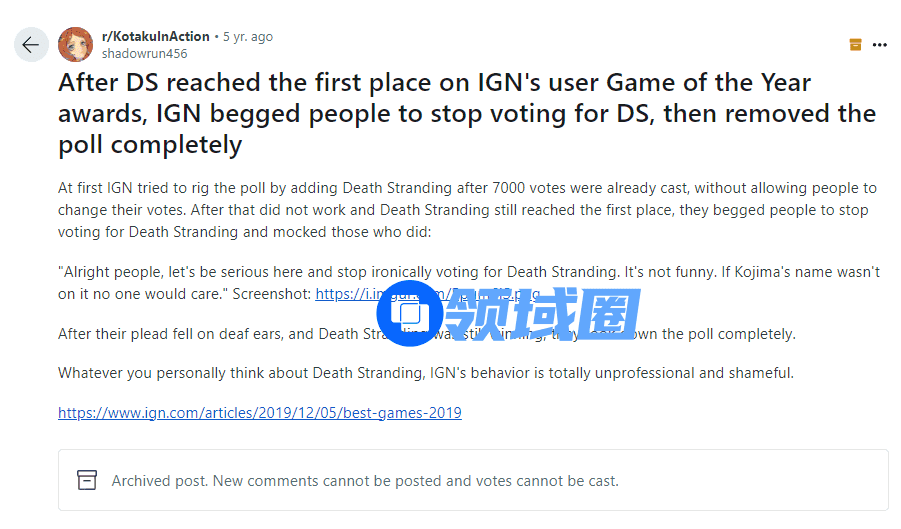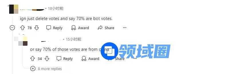 在Reddit论坛上,有玩家对此调侃道:”IGN只需要删个榜,再说70%的票都是机器人和中国玩家投的就行了。”